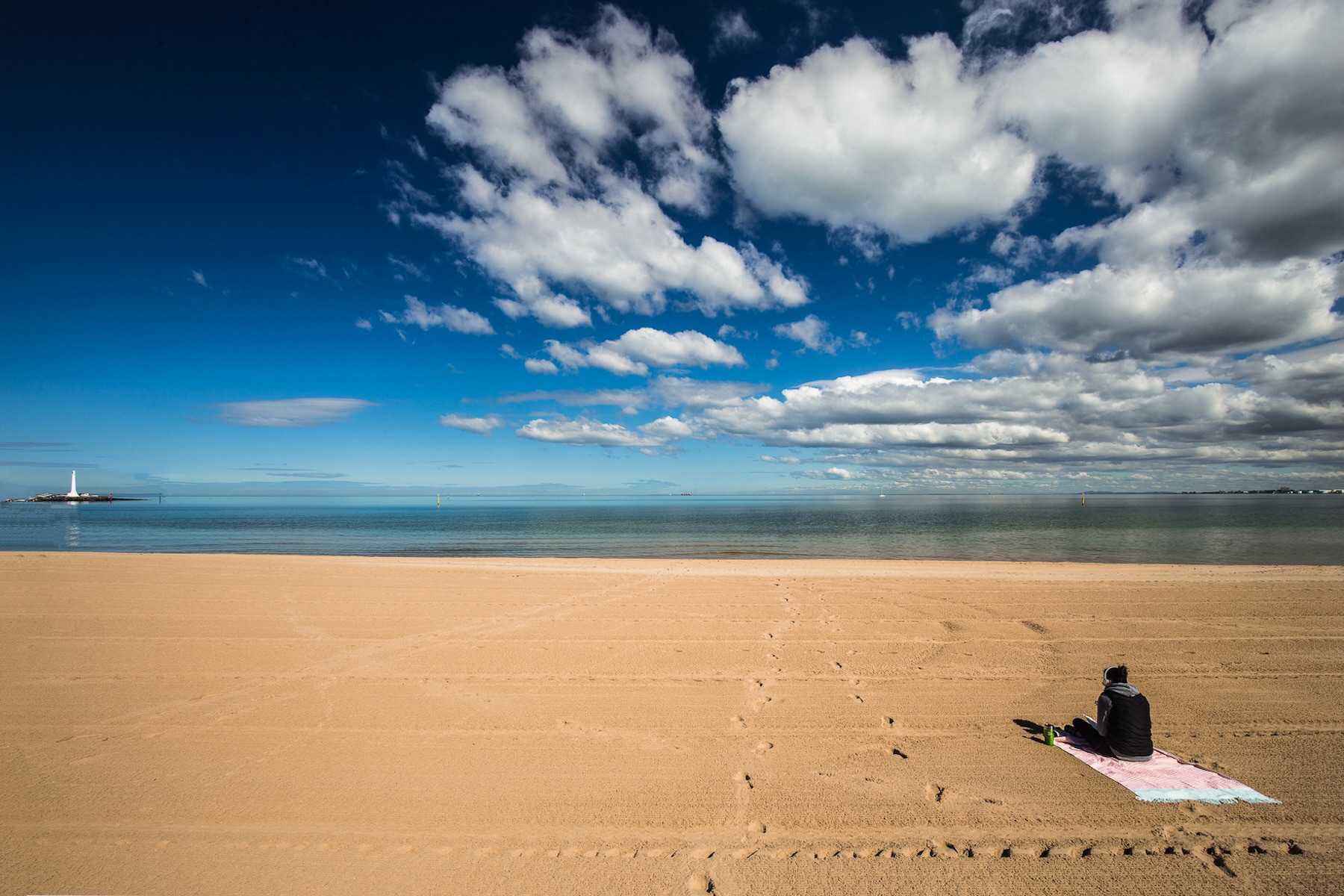 Sand grooming at Brighton Beach involves artificial sand replenishment and erosion control measures. The beach is cleaned mechanically and maintained with actions include trucking in sand, creating sandbag walls, and implementing other erosion management works to protect the bathing boxes and shorelines. On this morning a lone beachgoer was enjoying the solitude.